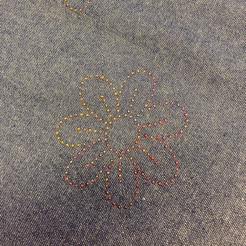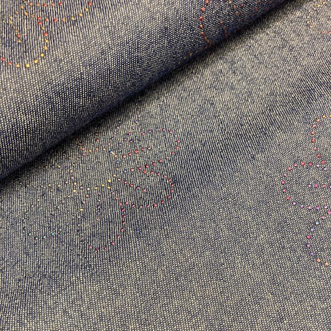 Een dunne jeansstof ( Chambray) met veelkleurige bloemen foil print ideaal voor het naaien van hemd, top broek, rok of kleed,