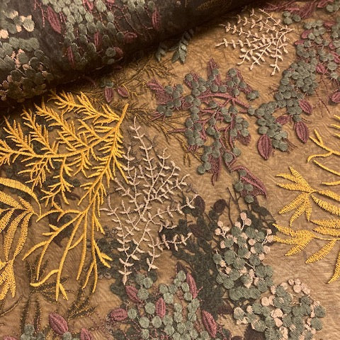 Een soepele zachte mesh of tulle met geborduurde bloemen en struiken ideaal voor het naaien van top, lange rok, kleed, of losse broek